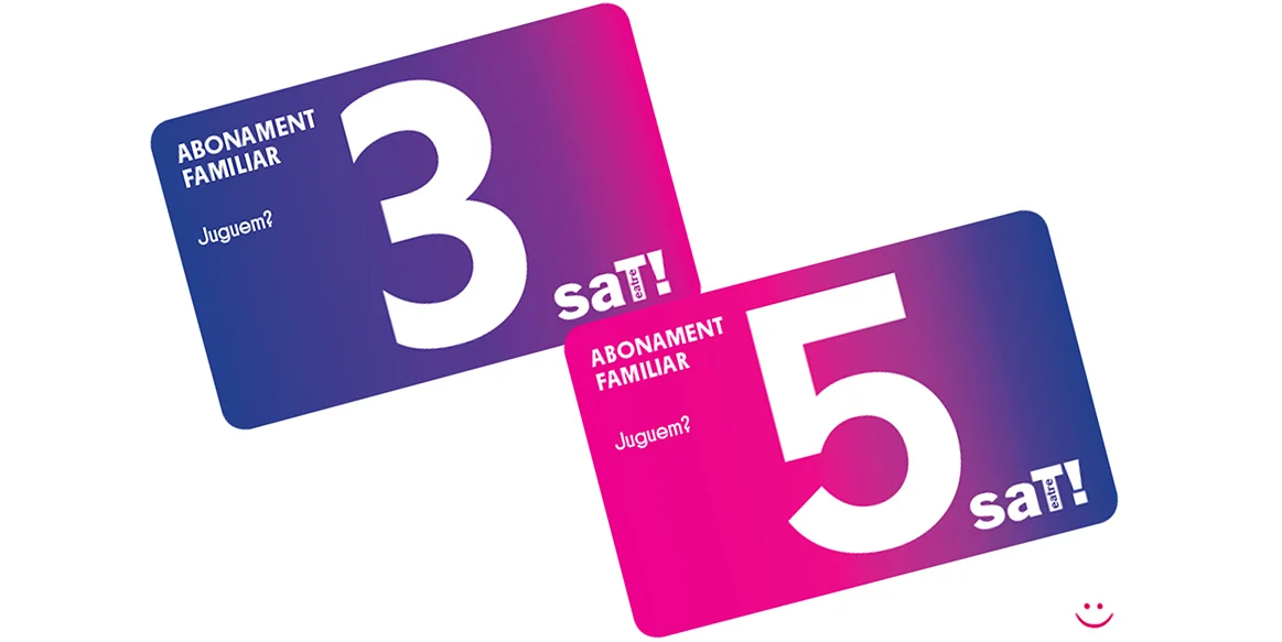 Amb els abonaments familiars SAT3 i SAT5 podràs venir a 3 o 5 espectacles amb un 20% o un 30% de descompte respectivament. Disponibles en packs per a 1, 2, 3 4 o 5 persones perquè cada família és un món.